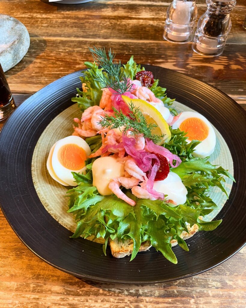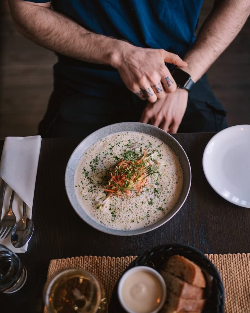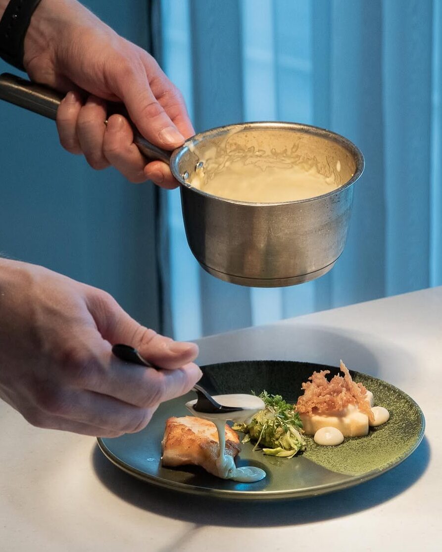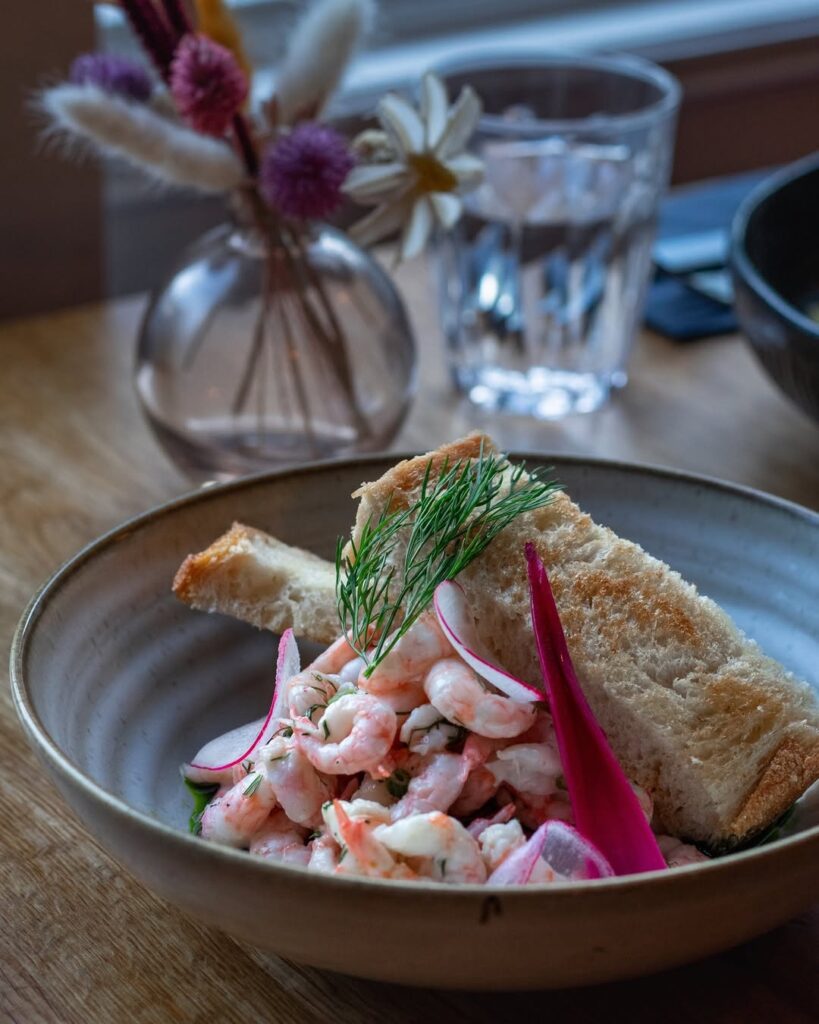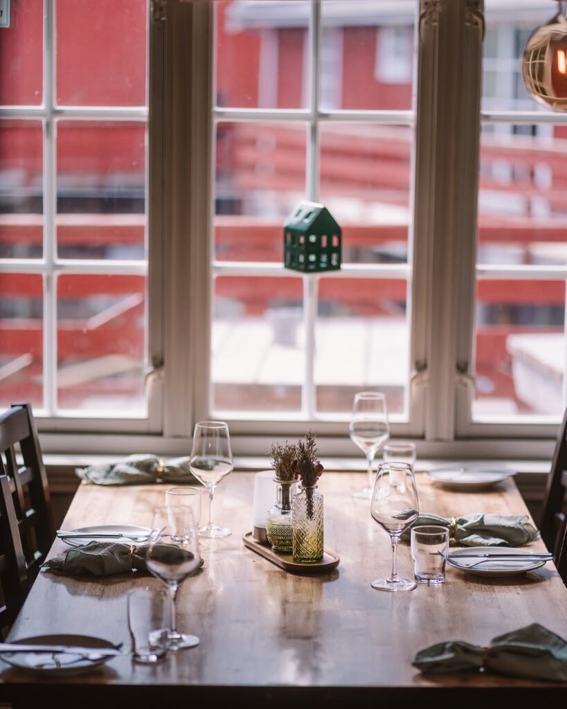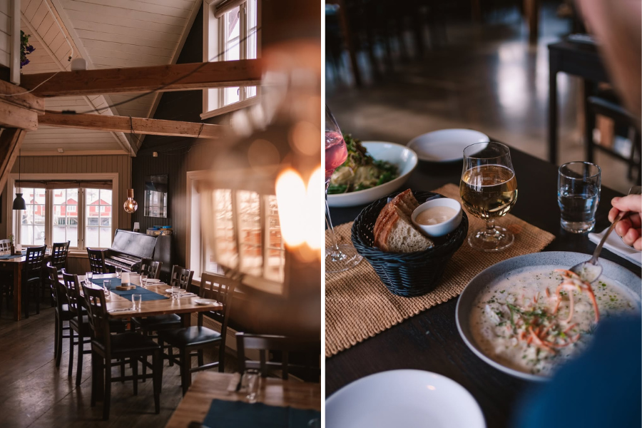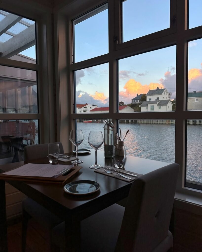 A konyha az északi-tengeri alapanyagokból indul ki: friss hal a közeli halászkikötőből, modern módon tálalt fogások, például posírozott halibut, céklás előételek, vadbogyós desszertek. Az enteriőr letisztult, nordikus, nagy ablakokkal, ahonnan a fjordot és a hegyeket nézheted evés közben. A séfek tudatosan, fenntarthatóan dolgoznak, szoros kapcsolatban a helyi termelőkkel, halászokkal.