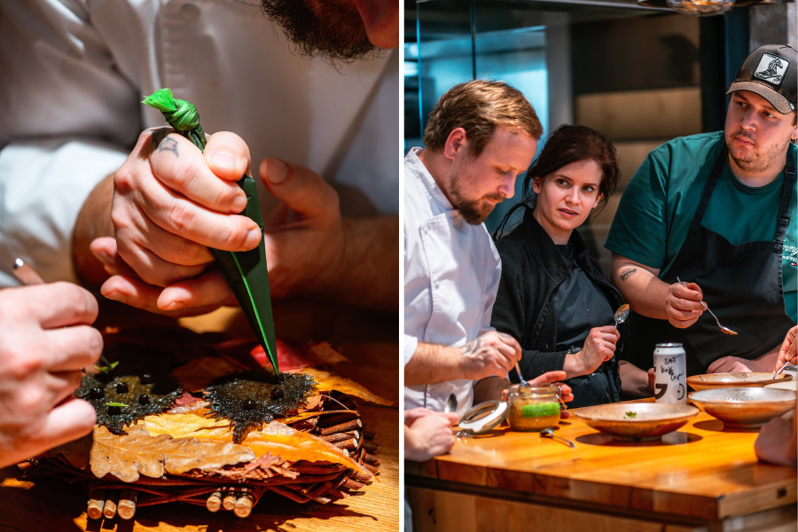 Az étterem szívében álló séfasztal közvetlen kapcsolatot teremt a vendég és a konyha között, az élmény így nemcsak kóstolás, hanem valódi betekintés is a gondolkodásmódba. Minimalista tálalás, fesztelen, mégis magas szintű szerviz, bor- és alkoholmentes párosítások, amelyek finoman követik a menü ritmusát.
